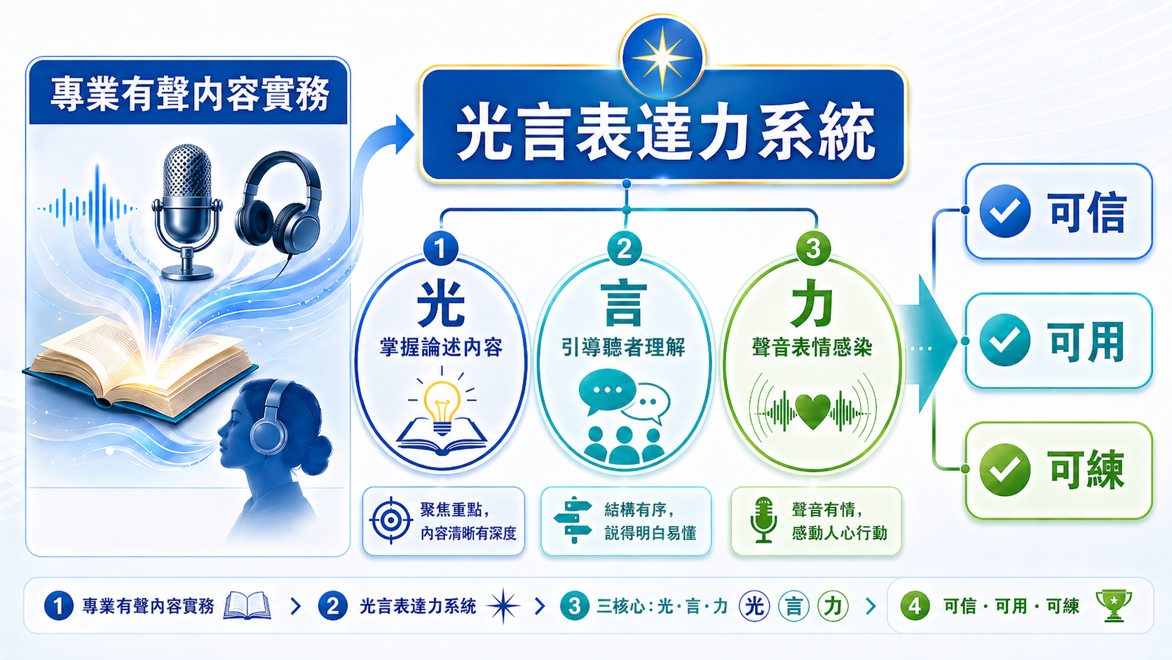 如果你常常覺得「明明有想法,卻說不清楚」、「準備很多,聽眾卻抓不到重點」、「一開口就緊張,聲音沒有力量」,你就需要光言表達力系統。